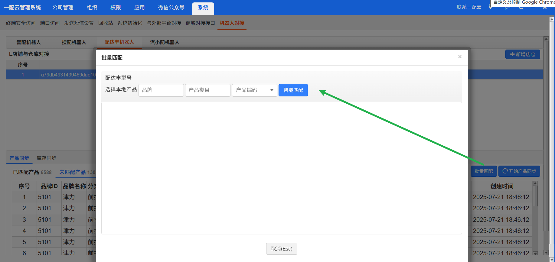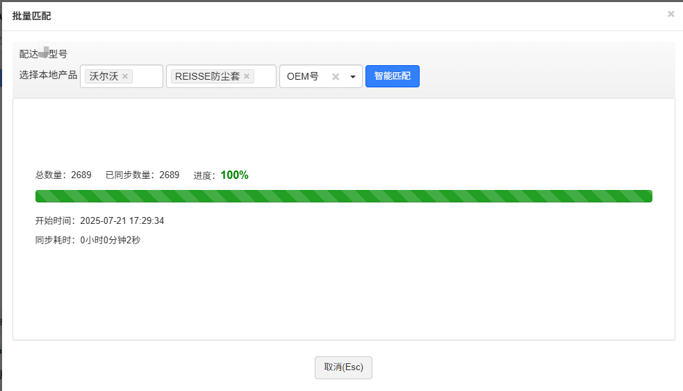 当点击【产品同步 > 未匹配产品】时,右侧点击【批量匹配】按钮,在弹出的对话框中选择本地产品的品牌、品类,对接配达丰型号的产品编码字段,点击【智能匹配】按钮,系统开始智能匹配,并给出匹配进度条。