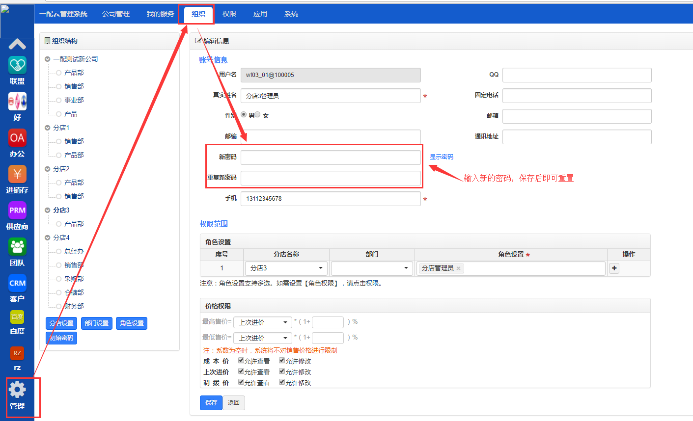 2、普通成员账号密码重置,在【管理 > 组织】页面,选择要修改成员账号,点【修改】按钮,在修改界面重新输入一下密码,保存后即可。