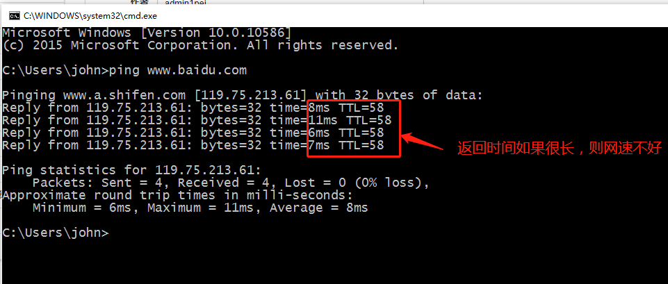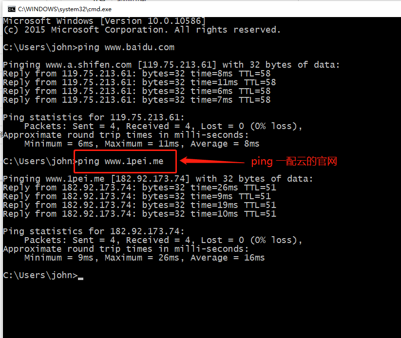 三、如果www.baidu.com能ping 通,则说明是可以上网的,但如果不能访问一配云,则需要ping一下一配云的网络
