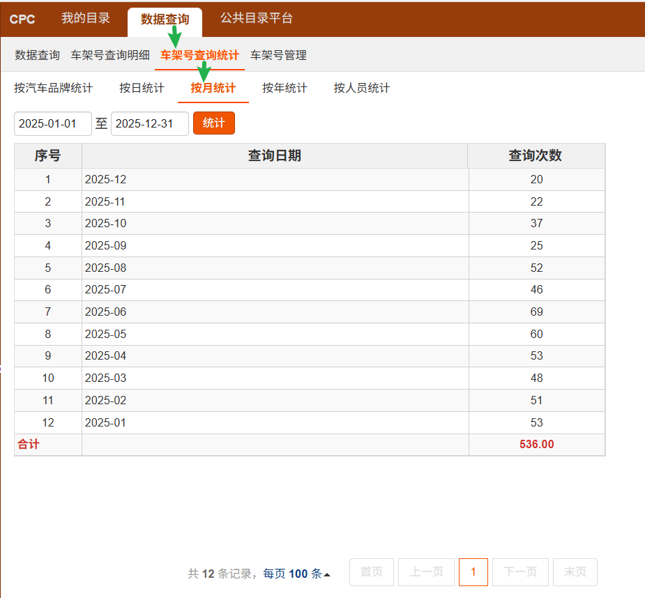 在【云目录 > 数据查询 > 车架号查询统计】中,可以按日、按月、按年统计。