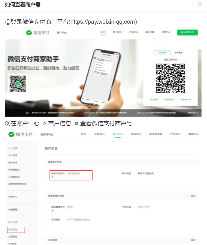 当点击 【如何查看微信支付商户号?】 以后,弹出下面窗口,提醒 在微信支付商户平台中,在【账户中心 > 商户信息】中可以查看到 微信支付商户号。