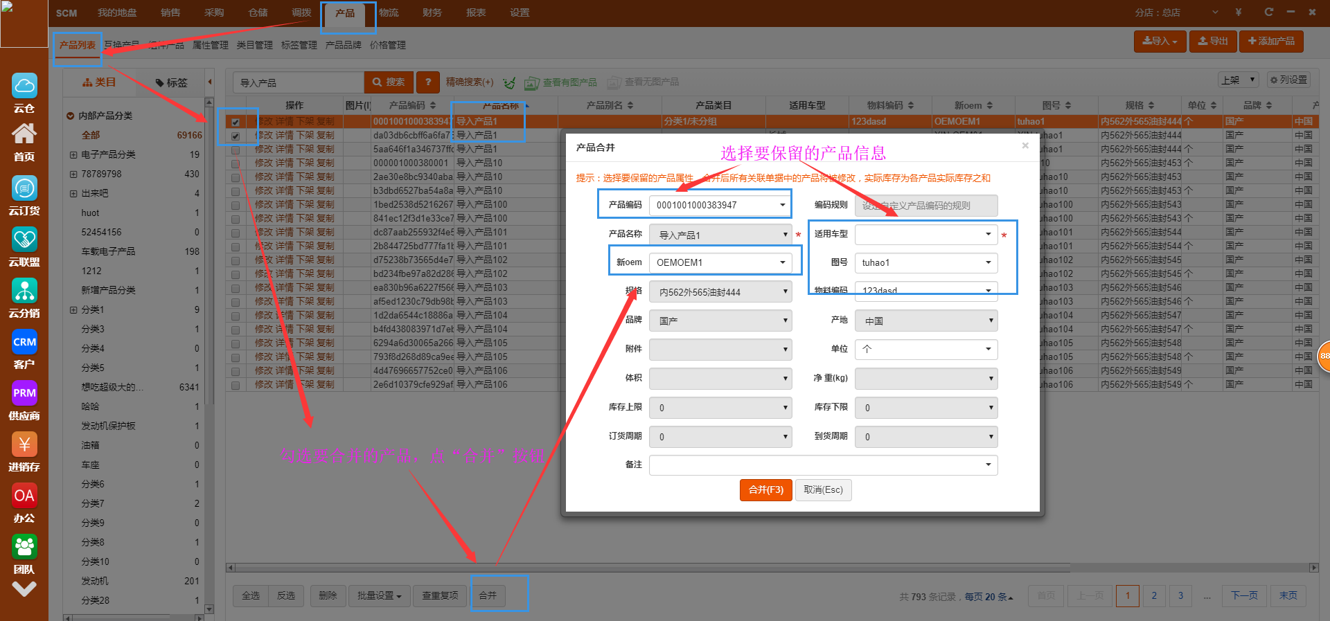 操作方法:在产品列表界面搜索要合并的产品,点“合并”按钮,在合并产品模态框中选择要保留的产品资料,确认后重复的产品就合并成了一个产品
