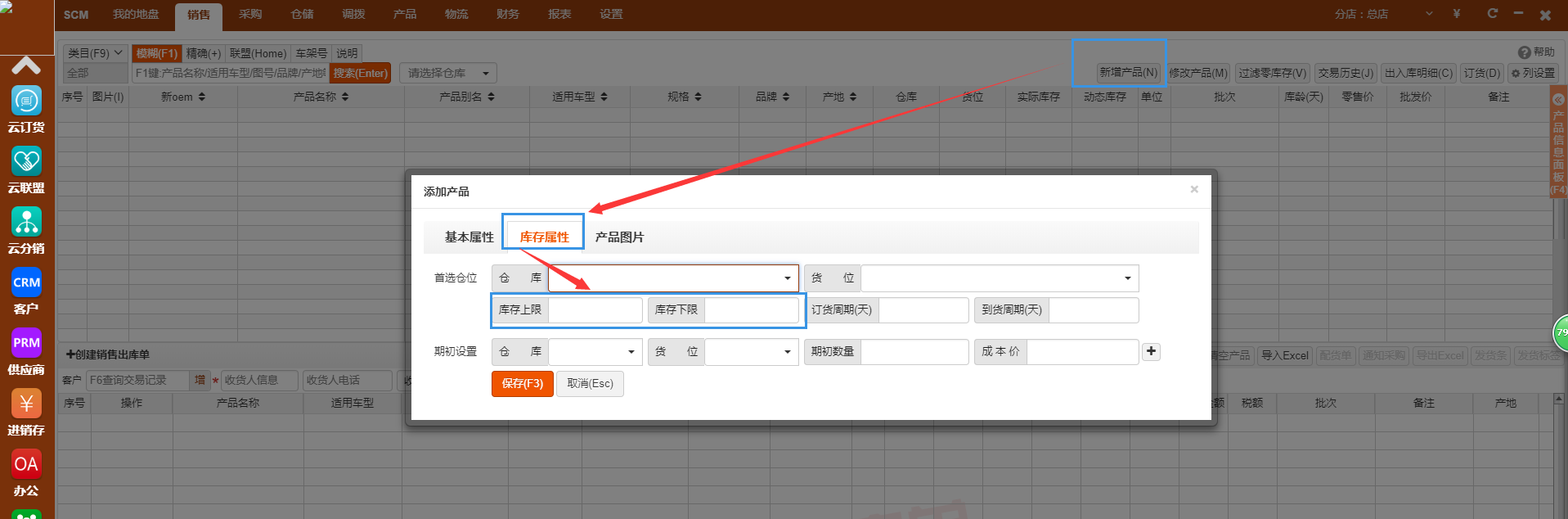 方法五、在销售类、采购类单据开单界面,点“修改产品”按钮,在修改产品模态框中点“库存属性”中,可以设置库存的上、下限