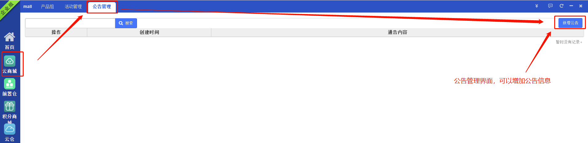 6、公告管理界面,可以增加公告信息,客户在订制手机APP上可以看到公告信息