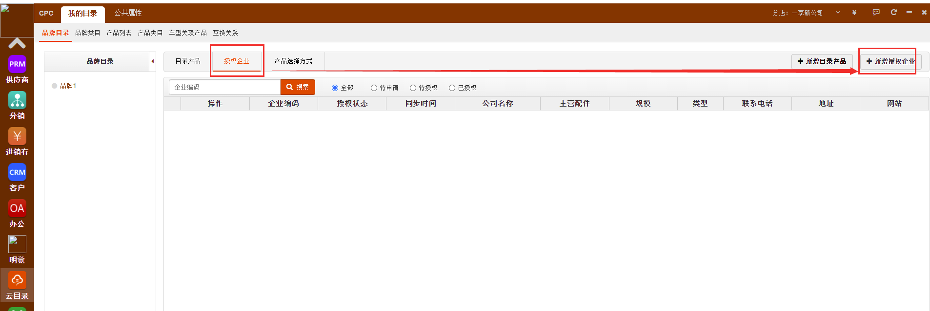 步骤3:到云目录>我的目录>品牌目录>授权企业界面,点击右上角的“新增授权企业”按钮,跳转到添加授权企业界面