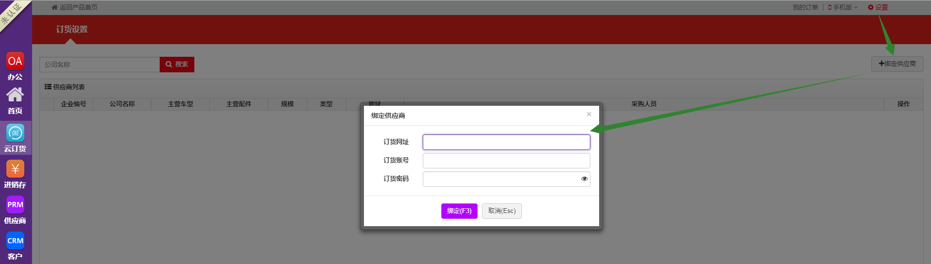 当点击设置按钮后,就可以点击"+绑定供应商" 按钮来绑定供应商给自己分配的订货网址、订货帐号和订货密码信息了。