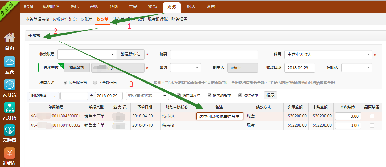 31. 财务>收款/付款界面可以修订业务单据的备注