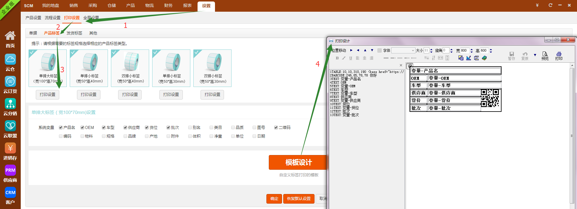在在进销存>设置>打印设置>产品标签中,选中标签规格后点击"打印设置"按钮,可以开始自定义打印样式。