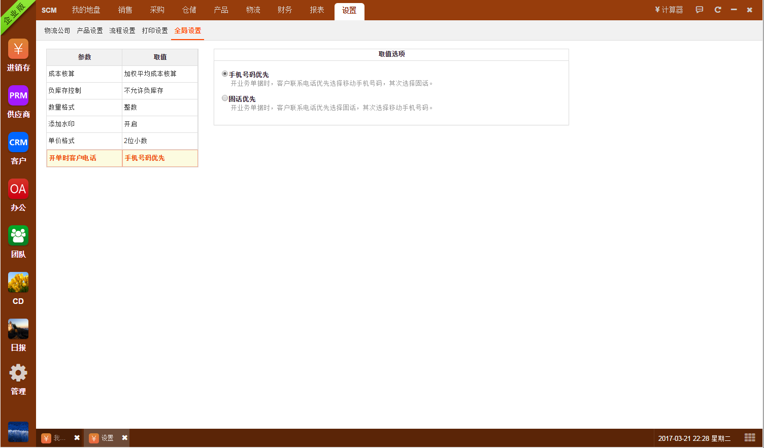 9. 新增设置开单时客户电话功能:可根据需要在全局设置中,选择固话或手机。选择后,打印单据中的电话会根据设置优先显示固话或手机号。