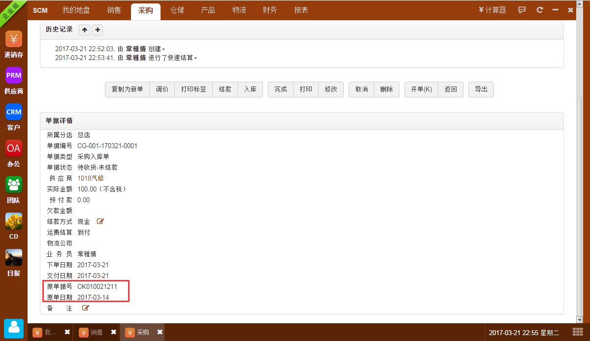 4. 新增记录采购单原单号、原单日期功能:采购入库单开单时,新增填写供应商原单号以及选择原单日期的功能,便于准确记录工厂单据信息,以便日后对账。