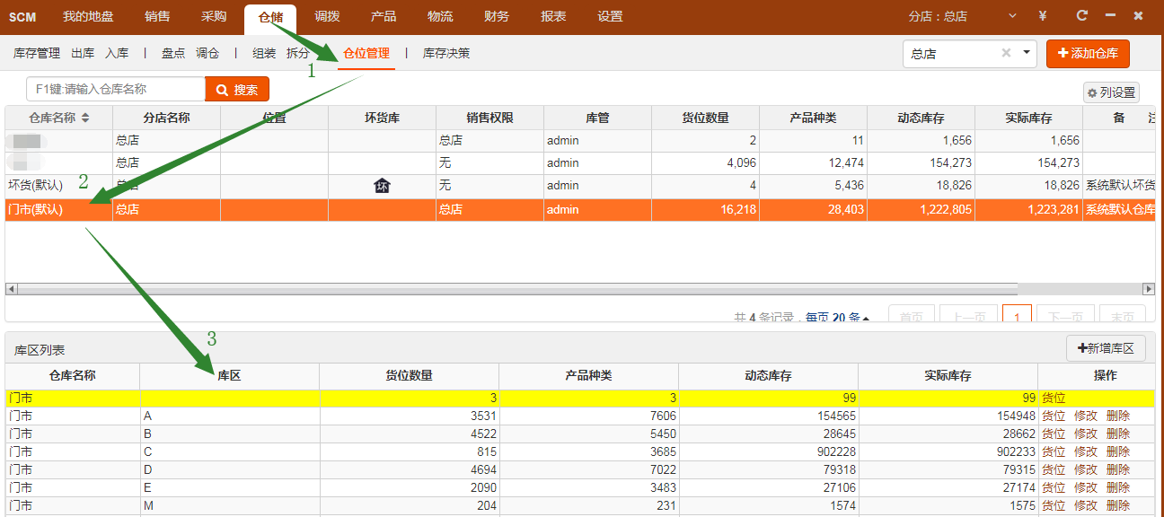 如果有货位还没有分配库区,则显示这一行,背景色为黄色,点击操作列中的货位按钮,来为这些货位及时分配库区;