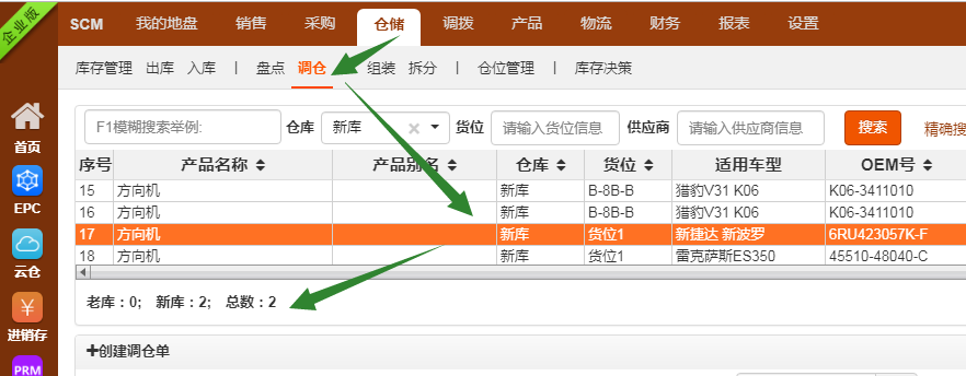 在仓储>调仓中创建调仓单时,显示本分店各个仓库中的(动态)库存产品数量以及总数。