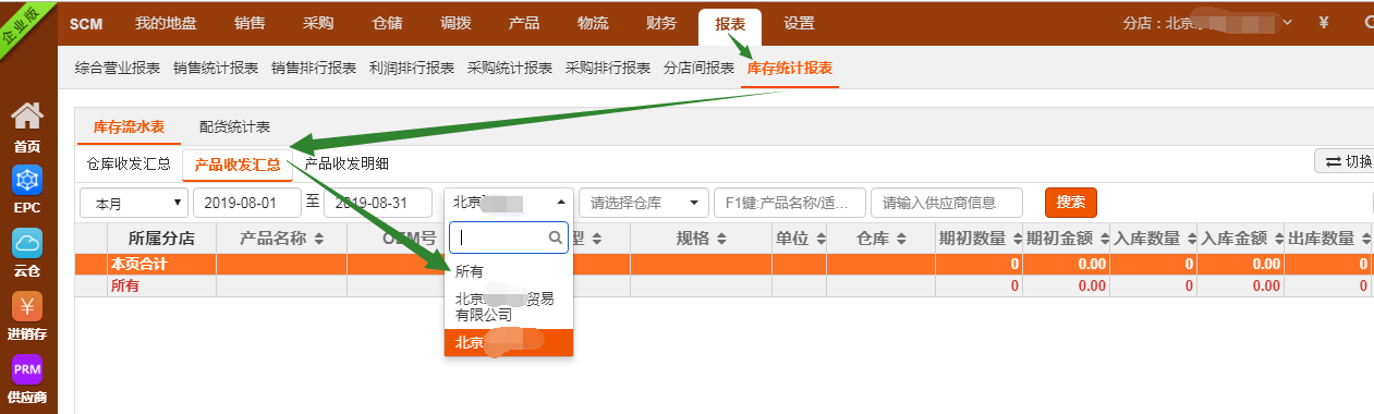 在进销存>报表>库存统计报表>库存流水表>产品收发汇总中,增加所有分店的统计。