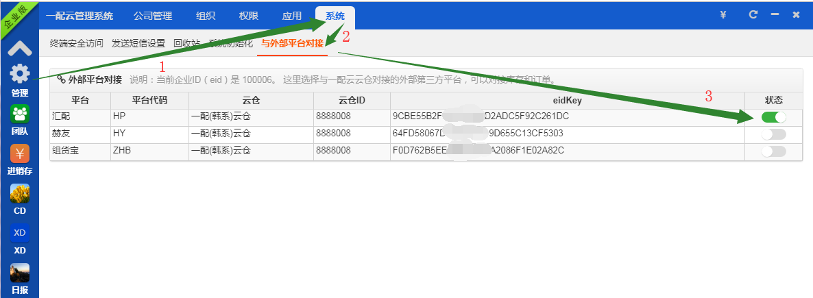 如果门店希望共享自己的库存给这些外部平台,首先门店需要加入到一配云的云仓中,系统会根据云仓ID和平台代码、以及当前企业ID来自动生成一个eidKey,这个eidKey是由外部对接平台来使用。