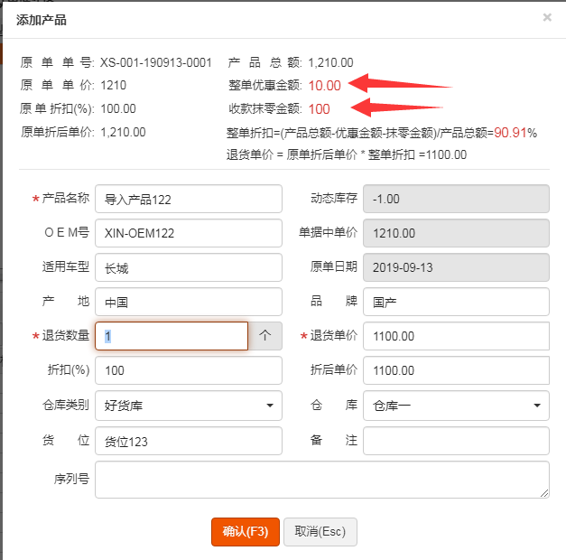1. 当销售时有整单优惠金额和财务抹零金额时,退货时显示出来