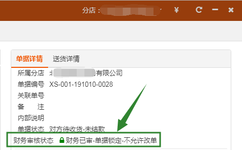 当财务审核后,显示为绿色,此时单据锁定,不允许再修改单据。