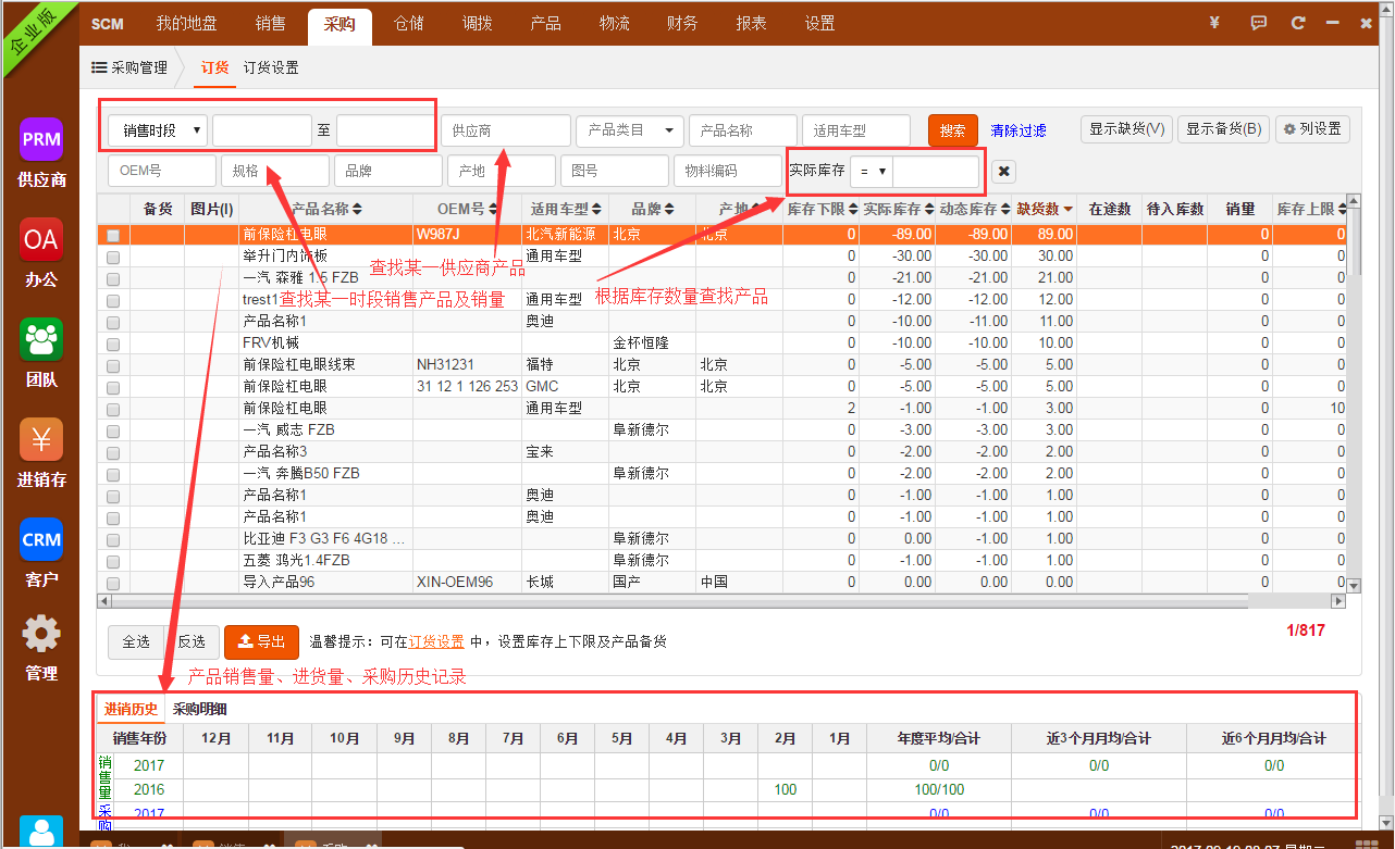在订货产品查询界面,支持根据销售情况、采购供应商、库存数量范围来查找产品进行订货: