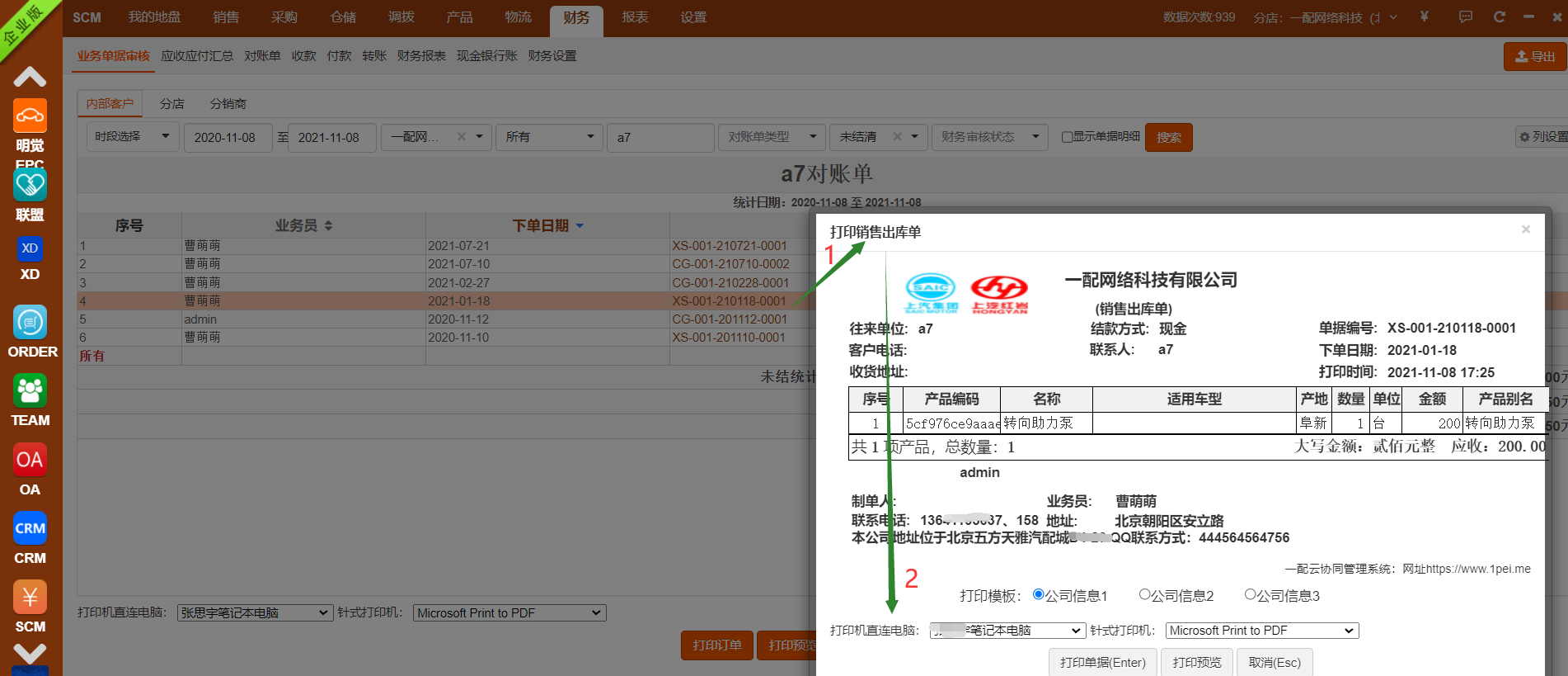 在 财务 > 对账单 页面,当点击业务单据单号,出现打印销售出库单 页面时,增加 打印机直连电脑 与 针式打印机 选项,以便打印 业务单据。