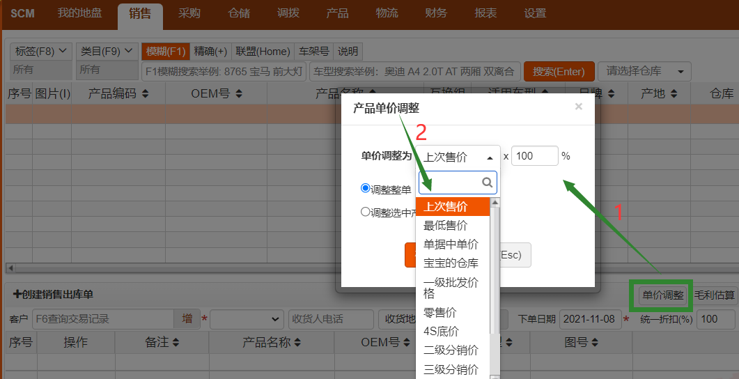 在开单界面产品单价调整模态框中,价格选择下拉框中新增 “上次售价”: