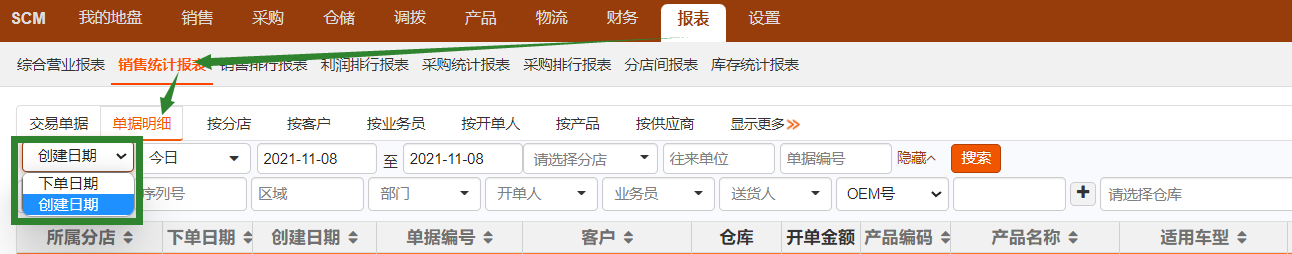 22. 报表 > 销售统计报表 > 单据明细 新增 下拉选择下单日期、创建日期 选项