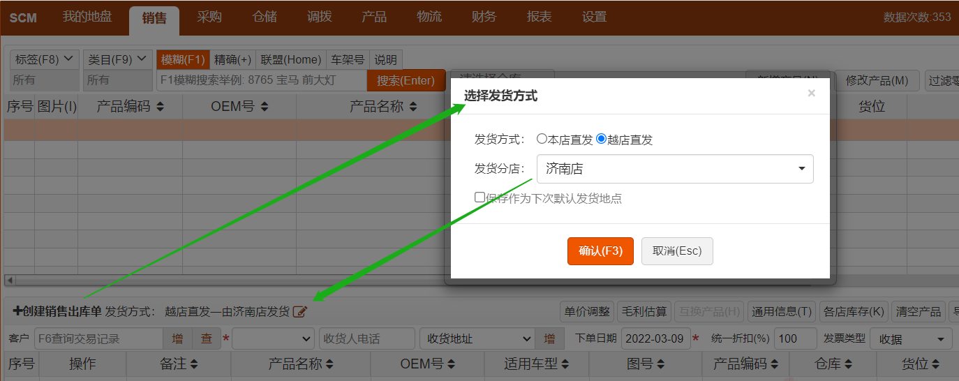 当新建一个销售出库单时,提醒选择 一种发货方式。如果勾选的是 越店直发,则选择发货分店,例如选择的是济南店,则在页面上会提醒开单员 现在的发货方式是越店直发—由济南店发货。