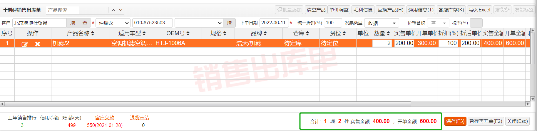 在销售开单界面,除了显示 实售金额以外,同时显示出 开单金额,以方便金额的对比查看。