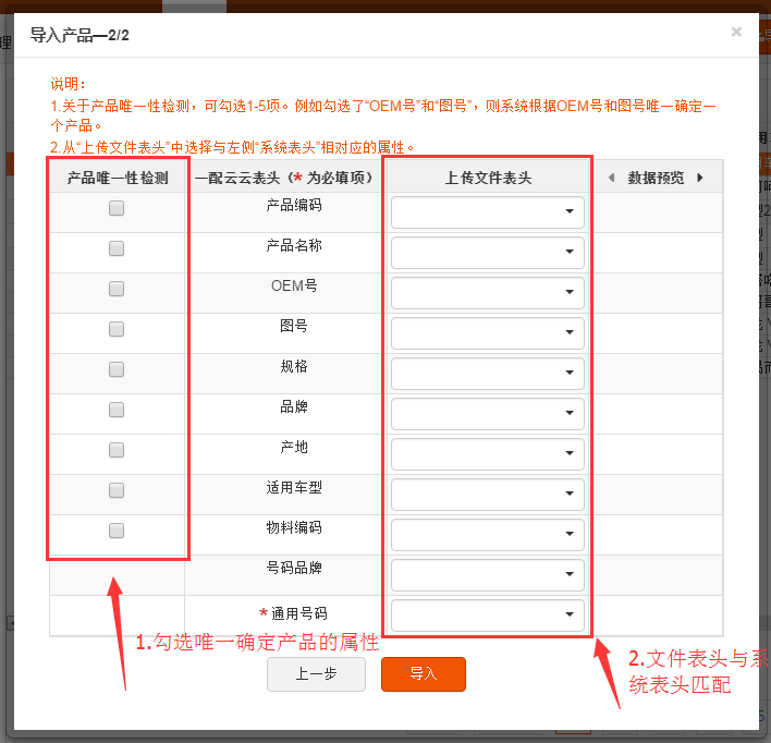 选择文件后,勾选唯一确定一个产品的属性(一般是OEM号、产品编码等号码),之后将表格文件的表头与系统中的表头进行匹配,即可实现通用号码的批量导入: