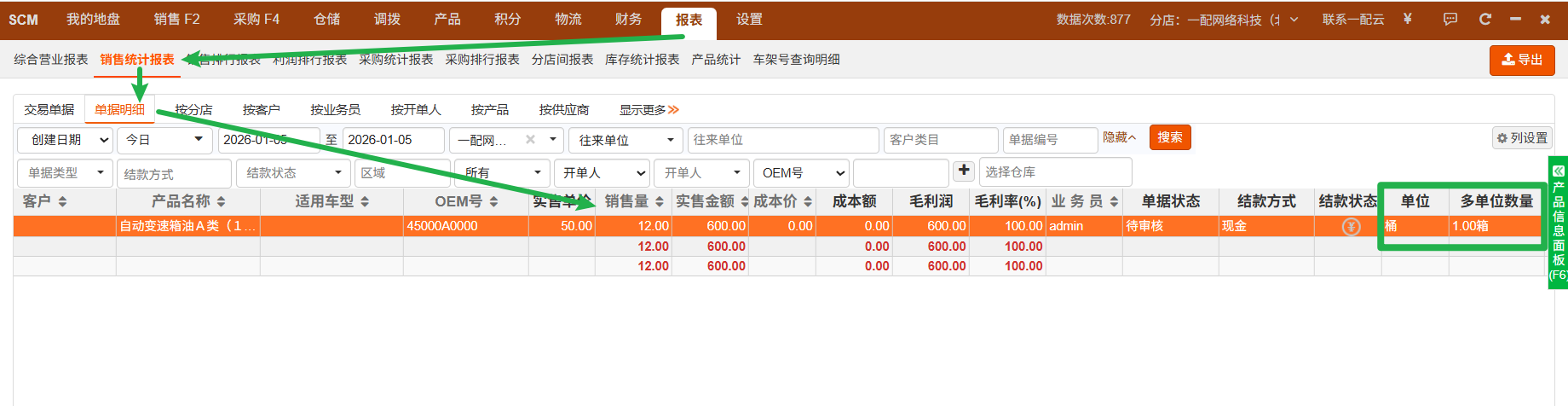 在【报表 > 销售统计报表 > 单据明细】中,是按照基本单位来显示数量,在多单位数量列中显示 1 箱。