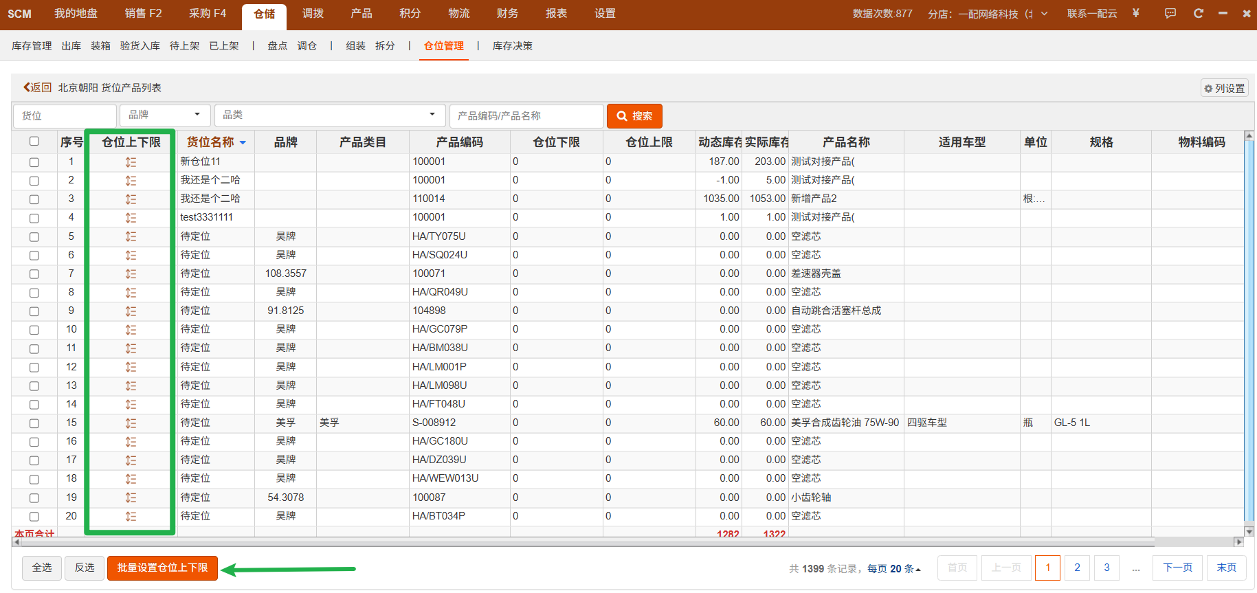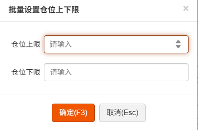 勾选一到多个产品后,点击【批量设置仓位上下限】按钮,用于批量设置某一个仓位(仓库+货位简称为仓位)上产品的上限与下限。