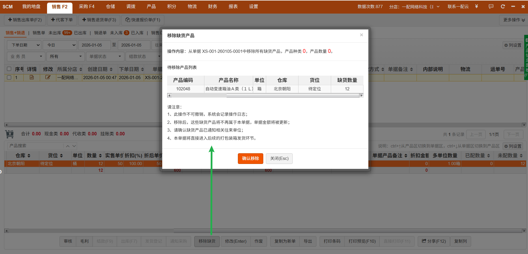 销售主界面单据产品列设置中增加 已配数量、未配数量两列,增加【移除缺货】按钮。