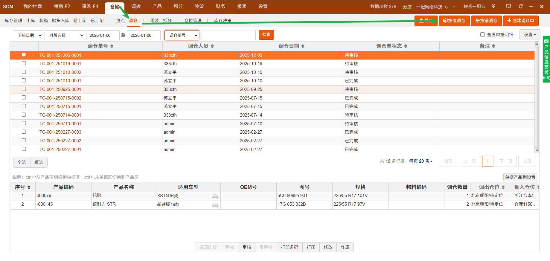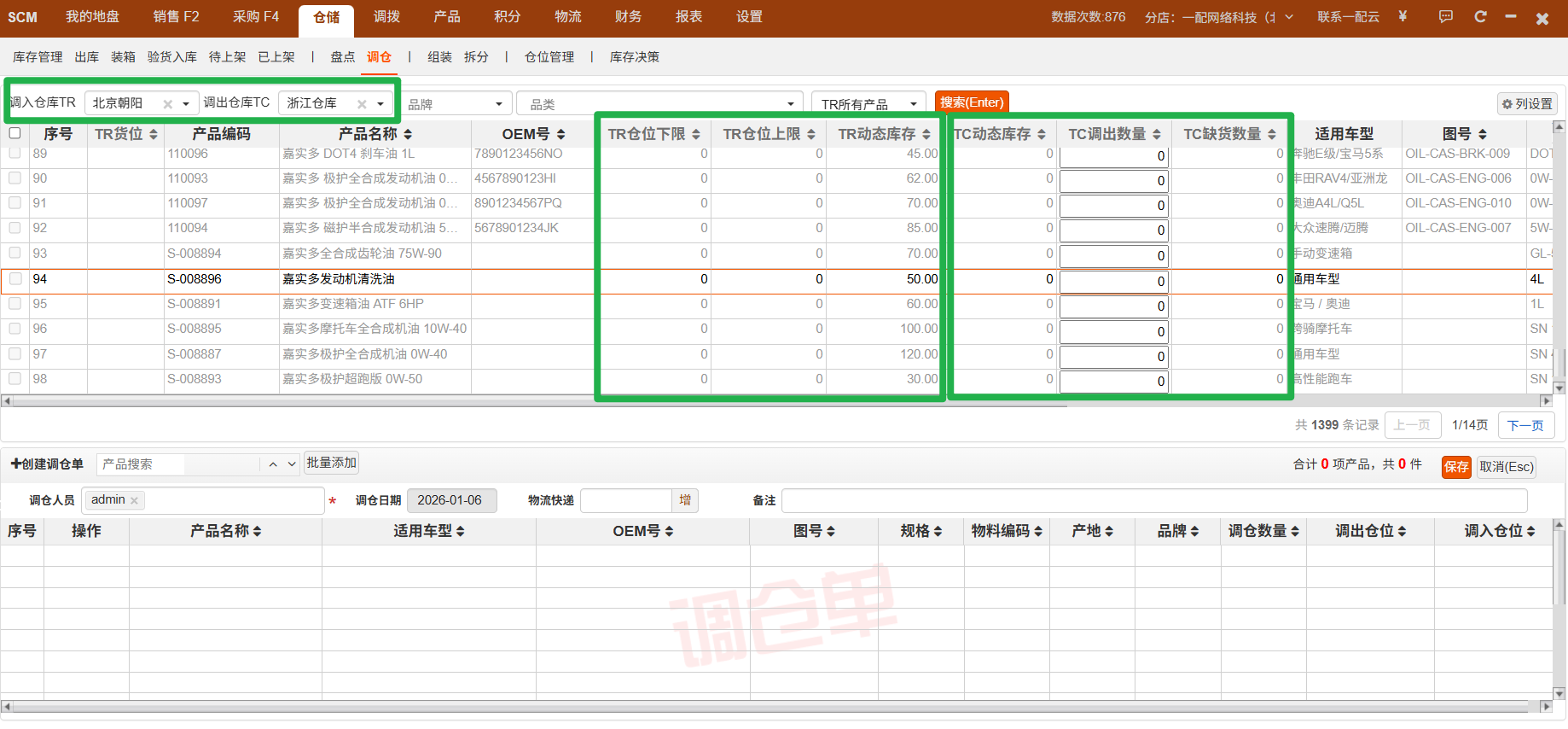 选择调入仓库TR、调出仓库TC,可以选择某个品牌、品类,选择TR上所有产品还是TR上缺货产品,从调出仓库TC 向 调入仓库TR来调仓。