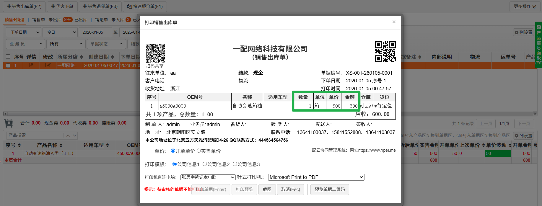 单据保存后,打印预览中显示数量为1,单位为箱,单价为600元。