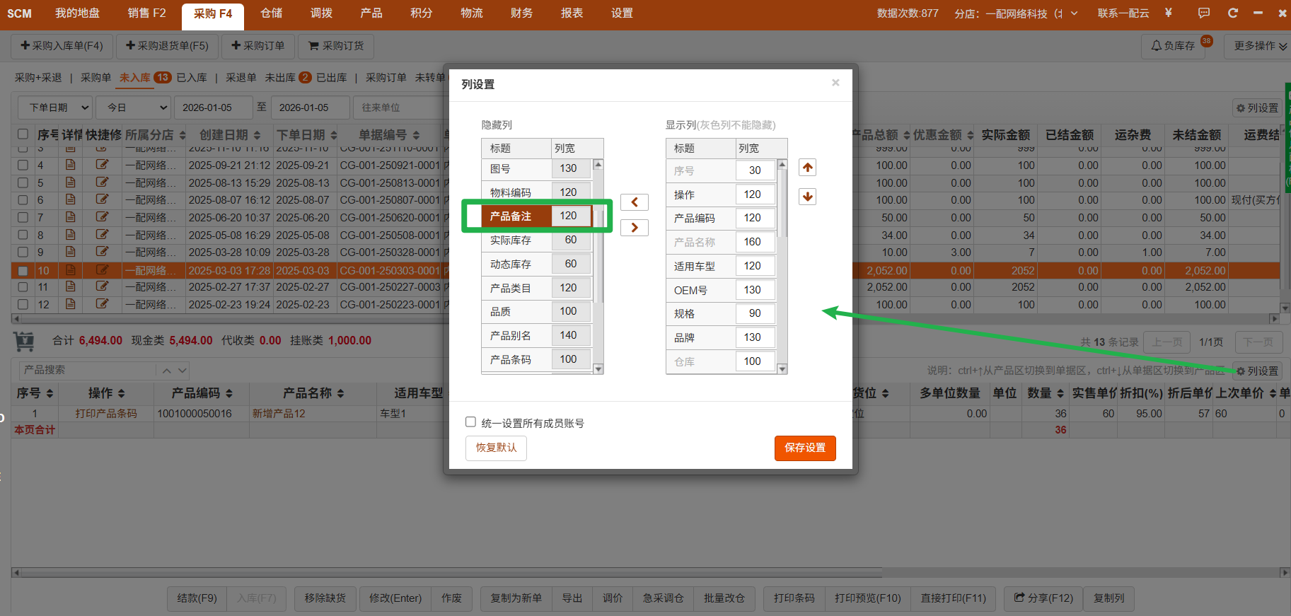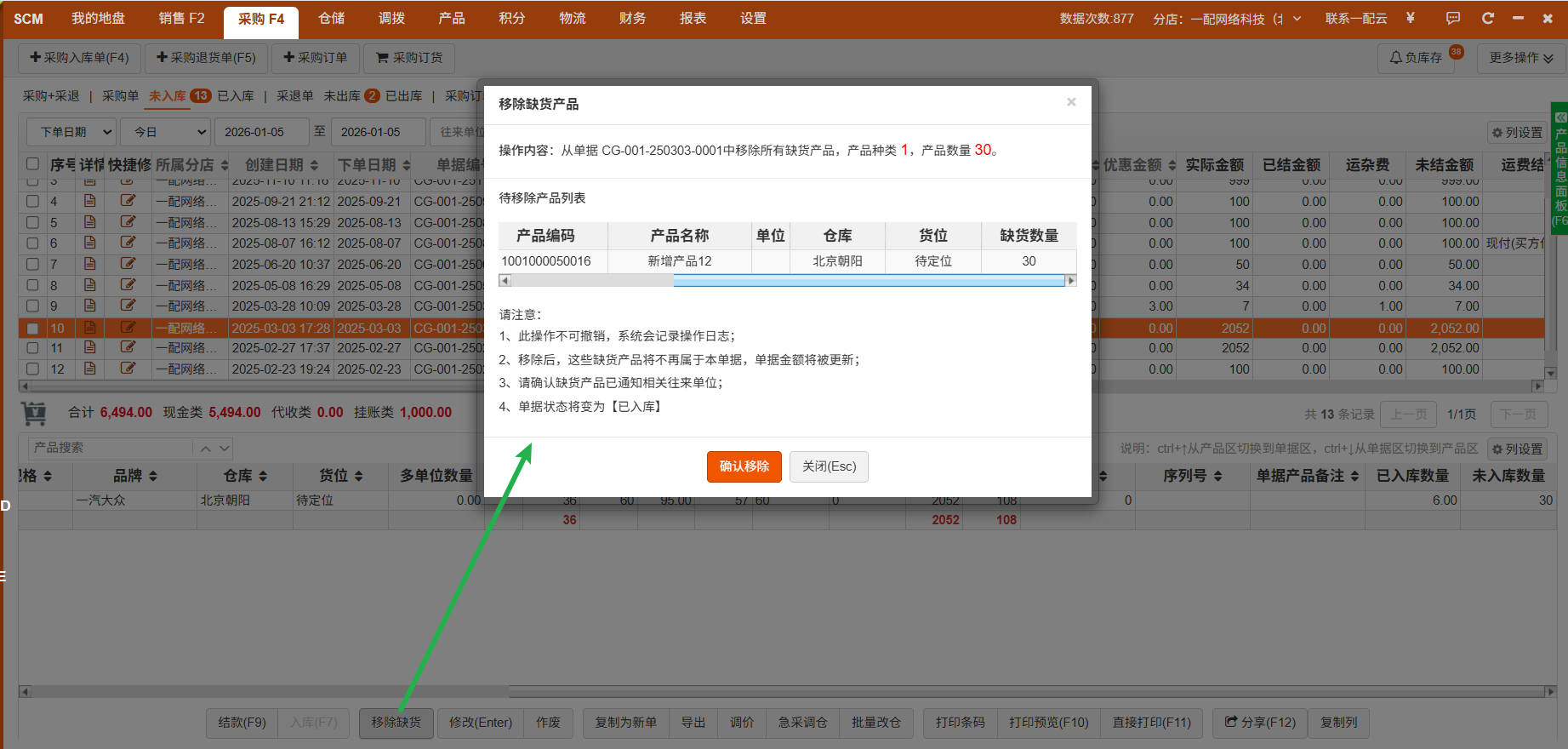 对部分入库的单据,在单据产品列设置中增加 已入库数量、未入库数量两列,增加【移除缺货】按钮。