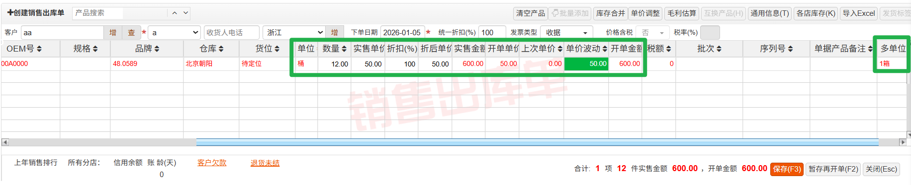 单位列显示基本单位,数量为12,实收金额为600元,多单位中显示 1 箱。